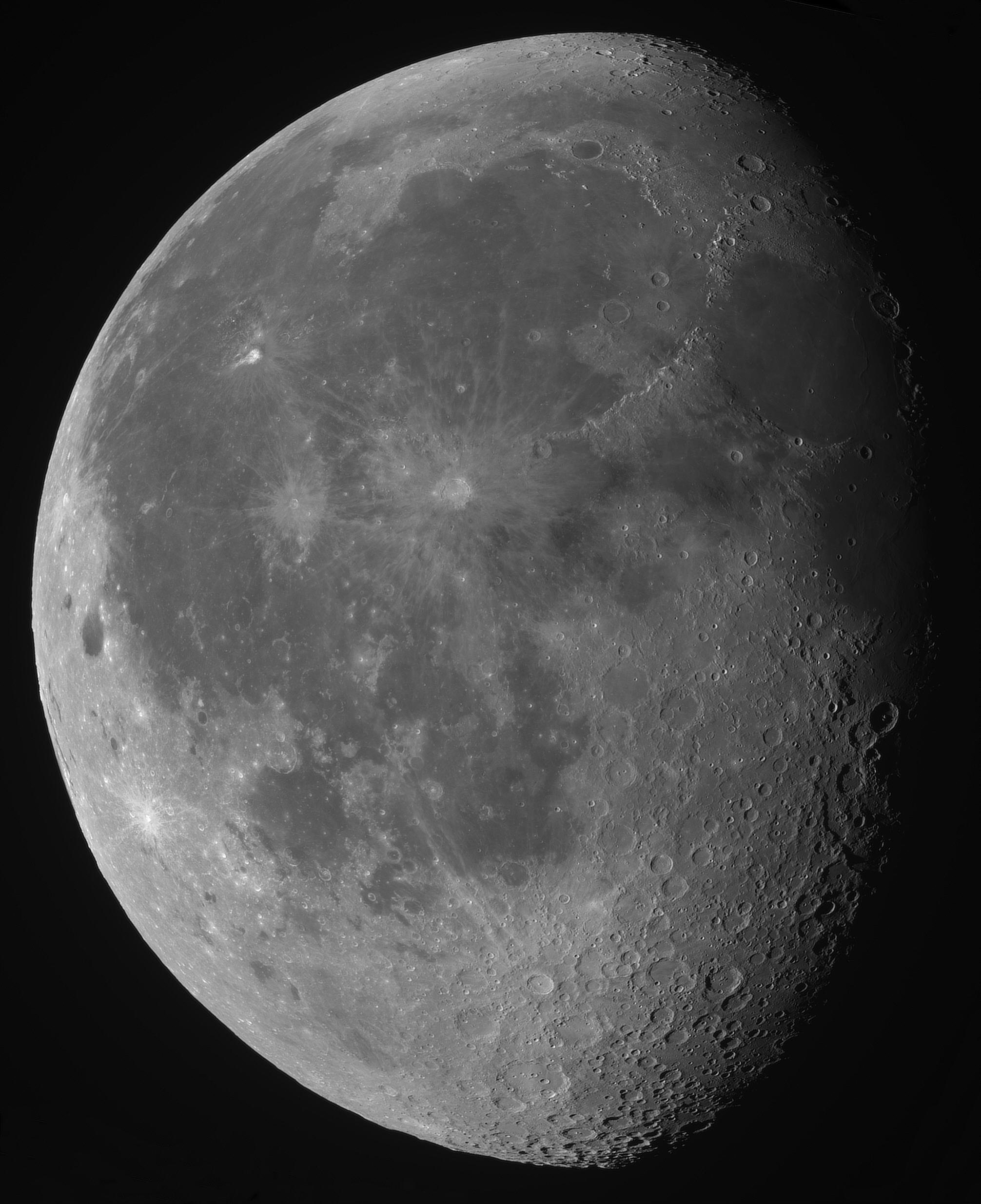 Als der Erdtrabant (2 Tage vor dem dritten Viertel) aufgegangen war, wollte ich noch mal den abnehmenden Mond fotografieren. In dieser Phase treten vor allem die Strahlenkrater, die zu den jüngsten Impaktstrukturen gehören, deutlich zu Tage.