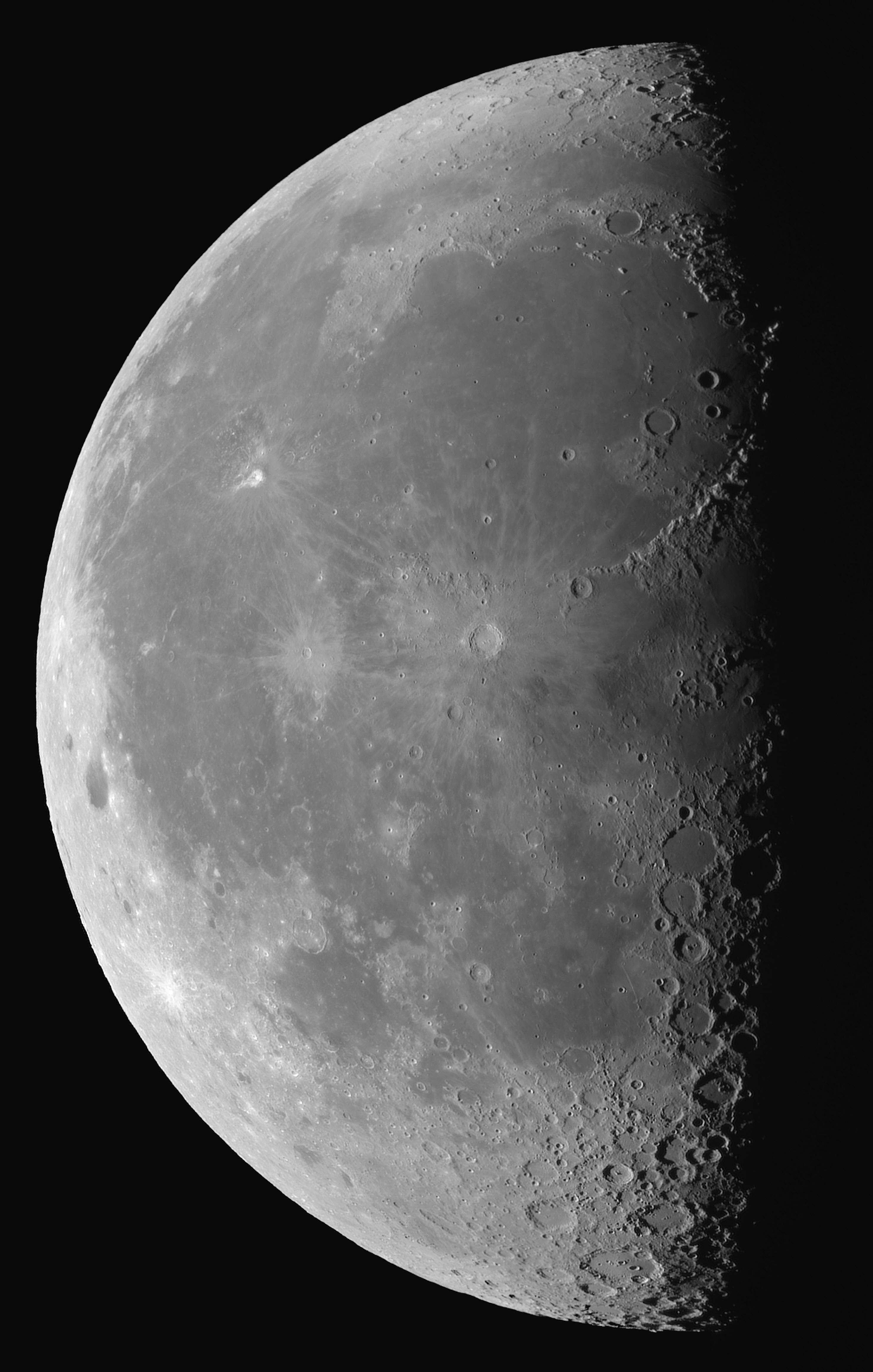 Einen Tag vor dem dritten Viertel wird der westliche Teil des Ringwalls um das Mare Imbriums schön angeleuchtet. Außerdem liegen am Terminator einige Krater bereits im Dunkeln, und nur die Spitze des Zentralbergs erhält noch ein wenig Sonnenlicht, so dass sie als heller Punkt im dunklen Krater leuchten. Beispiele sind die Krater Albategnus unterhalb der Mitte und Hipparchus darüber. Hipparchus hat offenbar eine größere Lücke im östlichen Kraterrand, durch die noch einiges Sonnenlicht ins Kraterinnere fällt. Ein weiteres Beispiel für eine Zentralbergspitze im Sonnenlicht finden wir am unteren Mondrand mit dem Krater Moretus. Aber auch der helle Mondrand ist interessant, weil er an einigen Stellen hohe Mondberge bzw. Kraterränder erkennen lässt, die aus dem Rund der Mondkugel herausragen. Und immer wieder schön ist die geschlängelte Kraterkette westlich des prominenten Kraters Copernicus (etwa in Bildmitte)