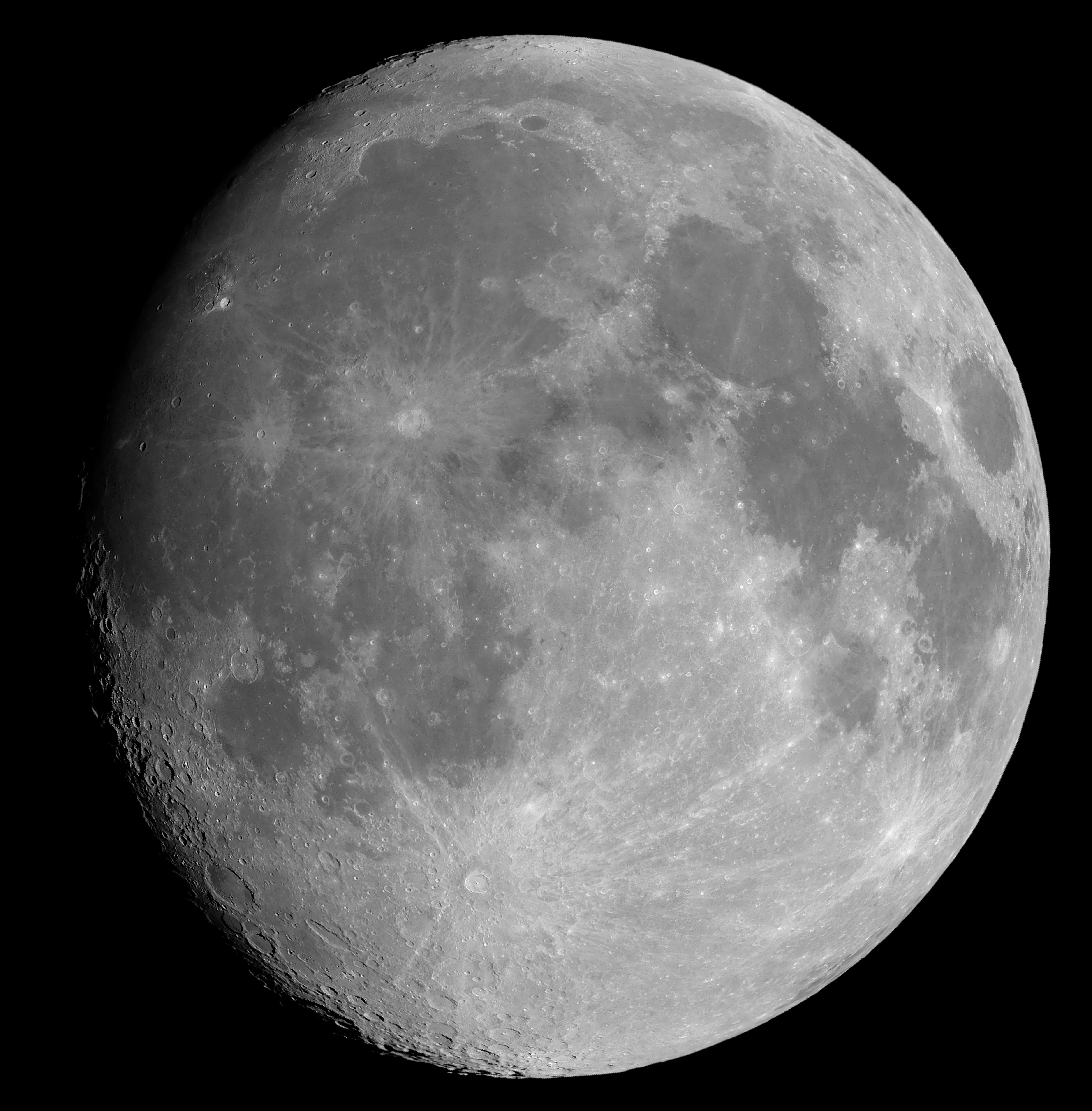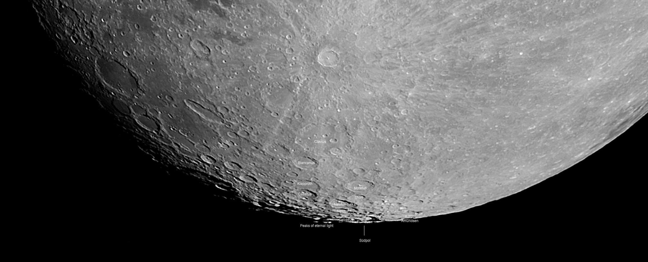 Der Mond stand am 24.02.2021 hoch am Himmel, so dass ich mich entschloss, ihm eine Aufnahmeserie zu gönnen. Die Phase war 3 Tage vor Vollmond. Und das Schrötertal, von einem kleinen Krater nördlich der beiden Krater Herodot und Aristarchus ausgehend, war bestens zu sehen. Datum: 24.02.21, 22:39h MEZ Optik: f=750 mm f/5,4 Nachführung: keine Gesamtbelichtungszeit: 6 Sekunden (Einzelbilder: 0,01 Sekunden) Kamera: Atik 460EX Filter: 12 nm [OIII] von Astronomik
