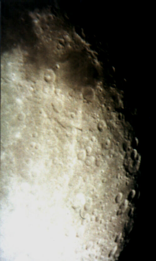 Mond - kurz nach Vollmond. Östlicher Teil Links oben Sinus Asperitatis, an den sich das Mare Nectaris anschließt. Am Übergang liegt der Krater Theophilus (Ø 100 km, mit Zentralberg), nordöstlich von ihm Mädler (Ø 28 km). Am Südrand des Mare Nectaris liegt die Wallebene Fracastorius (Ø 124 km).Auf dem Weg von ihr zum Krater Janssen (Ø 190 km), der am rechten Bildrand am Terminator liegt, ist gut der Krater Piccolomini (Ø 88 km) mit seinem Zentralberg sichtbar. Die hellen Streifen, die z.B. bis zu Fracastorius und Theophilus laufen, sind Strahlen von Tycho, der nicht mehr mit auf dem Bild ist. Datum: 27.01.97, 6.00h MEZ Optik: Okularprojektion durch C9 (f=2350 mm f/10) mit 26 mm Okular Nachführung: keine manuellen Korrekturen Belichtungszeit: 1/4 sek Film: Scotch Chrome 400 |