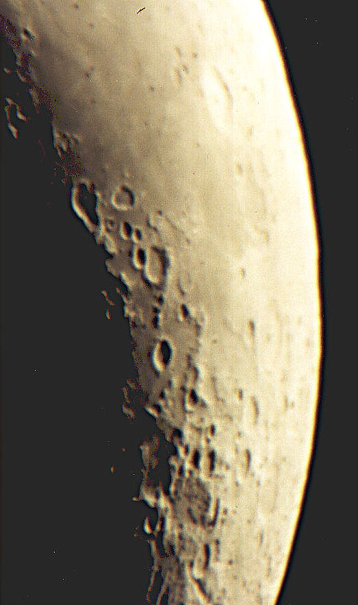 Der große Krater darunter heißt Santbech (Ø64 km). Rechts darunter ist der Krater Borda (Ø44 km) sichtbar. Datum: 16.02.02 Optik: C9 (f=2350 mm f/10) + 17 mm Okular Nachführung: CG9, keine manuellen Korrekturen Belichtungszeit: 1/2 sek Film: Kodak Royal 400 |