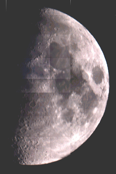 Das nebenstehende Mosaik des Monds entstand am 06.10.00. Der instrumentelle Aufbau ist leider noch immer provisorisch. Die Aufnahmen wurden durch ein C5 (f=1250 mm) mit einer Integrationszeit von 0,02 Sekunden und einer Verstärkung von 10% gemacht. Überraschenderweise war die Belichtungszeit auch am Mondrand nicht zu lang. Ganz im Gegensatz zu meinem ersten Versuch. Allerdings habe ich seit ein paar Tagen auch eine neue Version der Aufnahmesoftware im Einsatz. Außerdem wurden die Aufnahmen durch die Fensterscheibe des geschlossenen Zimmerfensters gemacht. Es handelt sich bei allen Aufnahmen um Rohbilder. Eine üblicherweise notwendige Korrektur hinsichtlich Darkframes, Flatfields hat nicht stattgefunden. Die Nachbearbeitung mit einem Bildbearbeitungsprogramm bestand darin, Helligkeit und Kontrast ein wenig anzuheben und das Bild etwas zu schärfen, um den Schärfeverlust, der durch das JPEG-Format entsteht, auszugleichen. |