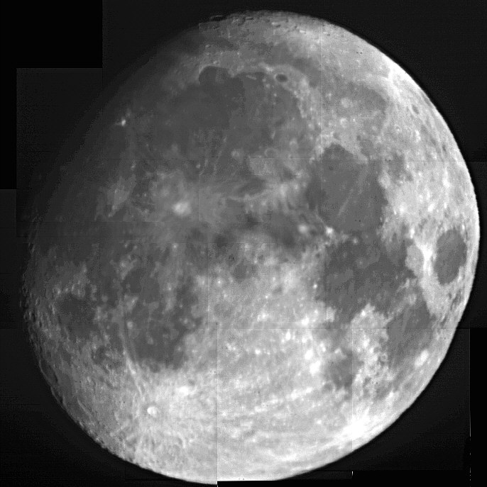 Das nebenstehende Mosaik des Monds entstand am 10.10.00. Der instrumentelle Aufbau ist leider noch immer provisorisch. Die Aufnahmen wurden durch ein C5 (f=1250 mm) mit einer Integrationszeit von 0,02 Sekunden und einer Verstärkung von 10% gemacht. Da die Belichtungszeit außer am Terminator zu lang gewesen wäre, habe ich das C5 mit einer 2-Lochblende (Scheinerscheibe) abgeblendet. Der Lochdurchmesser betrug ca. 25 mm. Durch die zwei sich gegenüberliegenden Löcher hoffte ich trotz Abblendens das Auflösungsvermögen der 125mm-Optik zu erhalten. Mit Einschränkungen: Die Aufnahmen wurden durch die Fensterscheibe des geschlossenen Zimmerfensters gemacht. Es handelt sich bei allen Aufnahmen um Rohbilder. Eine üblicherweise notwendige Korrektur hinsichtlich Darkframes, Flatfields hat nicht stattgefunden. Bei diesem Mosaik habe ich beim Aufnahmeprogramm den Dynamikumfang konstant gehalten (Schalter dafür endlich gefunden!). Dadurch sind die Übergänge zwischen den einzelnen Aufnahmen in der Helligkeit nicht so hoch. Das Problem bei meinem Programm zur Herstellung von Mosaiken besteht darin, daß ich immer nur zwei Bilder übereinander legen kann. Wenn dieses nicht 100% exakt ist, kann es passieren, daß das Gesamtbild ein wenig verzerrt ist. Der Mondrand rechts unten weist z.B. eine Delle auf. Wenn man einen maqrkanten Krater beim Ausrichten und Übereinanderlegen von vier Bilder benutzt, kommen leicht Unschärfen herein. Die Nachbearbeitung mit einem Bildbearbeitungsprogramm bestand darin, Helligkeit und Kontrast ein wenig anzuheben und das Bild etwas zu schärfen, um den Schärfeverlust, der durch das JPEG-Format entsteht, auszugleichen. |