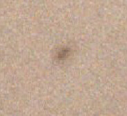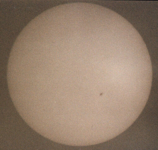 Sonne zu Beginn des aktuellen Fleckenzyklus'. Datum: 29.03.98 13.15h MESZ Optik: 60 mm Refraktor, f=700 mm Nachführung: keine Belichtungszeit: 1/500 sek Film: Kodak Select Royal Gold 400 | |