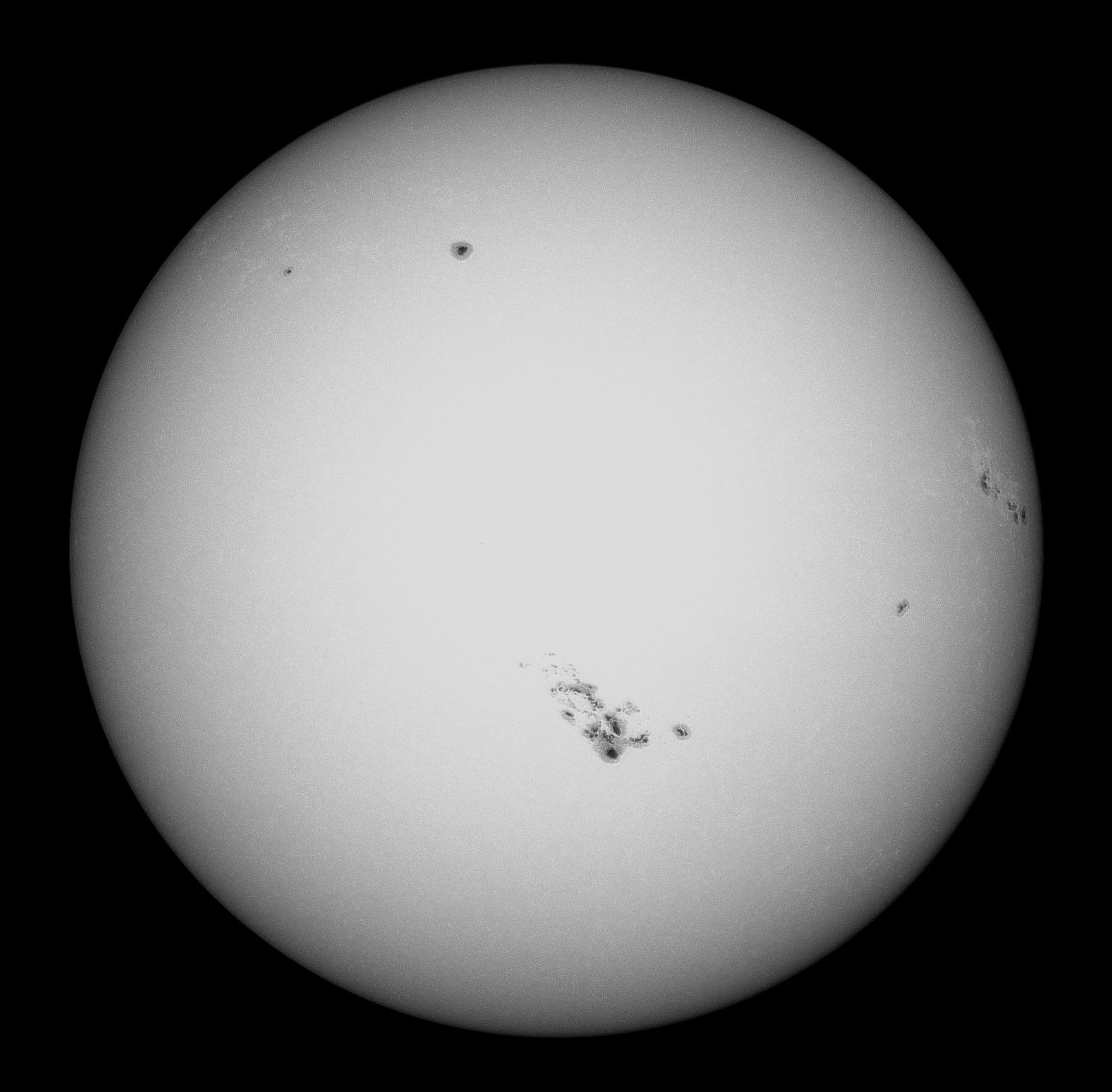 Dies ist nach 10 Jahren Pause mein erster Versuch, wieder einmal Sonnenflecken aufzunehmen. Obwohl die Bedingungen nicht ideal waren (Wind, Zirren, Luftunruhe), habe ich über einen Zeitraum von 80 Minuten 976 Bilder aufgenommen, von denen 25% von AstroArt für den Stack verwendet wurden. Das Summenbild wurde anschließend in Giotto mit dem Mexican hat-Filter geschärft. Trotz der insgesamt großen Luftunruhe (es war unmöglich, auf die wabernden Sonnenflecken scharf zu stellen) kam letztendlich ein annehmbares Ergebnis zustande.