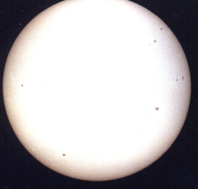 Sonne am 04. Juli 1999. Datum: 04.07.99 11.00h MESZ Optik: C9 f/10, f=2350 mm Nachführung: keine Belichtungszeit: 1/500 sek (=1/2 AUTO) Film: Kodak Select Royal Gold 400 |