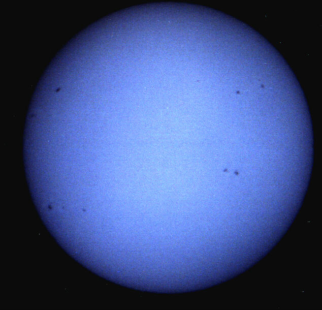 Sonne am 11. Juli 1999. Datum: 11.07.99 13.30h MESZ Optik: C5 f/10, f=1250 mm Nachführung: keine Belichtungszeit: 1/1000 sek (=1/4 AUTO) Film: Kodak Select Royal Gold 400 |
