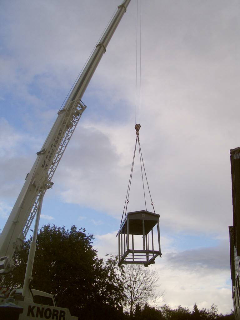 Es wurde schon bei der Auftragsplanung schnell klar, daß es der beste und kostengünstigste Weg war, die Sternwarte in meinen Garten per Autokran hineinzuheben. Die Kranbestellung und Aufstellung der Sternwarte wurde von meinem Metallbauer durchgeführt. Der 40 Tonnen-Kran hob die Sternwarte mit Leichtigkeit über die Häuser in meinen Garten. Der Kran war natürlich ein Riesenspektakel, vor allem für die Kinder in der Nachbarschaft. Die ganze Aktion dauerte inklusive des Abstützens des Krans und des Abbaus der Abstützung nur eine gute Stunde.
