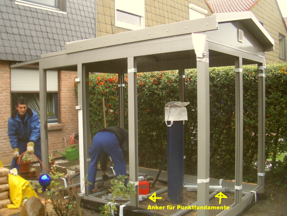 Geschafft ! Die Sternwarte steht an Ort und Stelle, und Kabelkanal und Säule passen genau in die Freiräume der Spriegel des Grundrahmens. Nun werden an den Grundrahmen Vierkantrohre als Fundamentanker geschweißt und die Schweißnähte mit Kaltverzinkung geschützt. Die Fundamentanker ragen in sechs gegrabene Löcher, die hinterher mit Beton ausgegossen werden und als Punktfundamente dienen. Vor dem Ausgießen ist die Sternwarte selbstverständlich waagerecht ausgerichtet worden. Die Arbeiten schritten trotz des Nieselregens zügig voran.