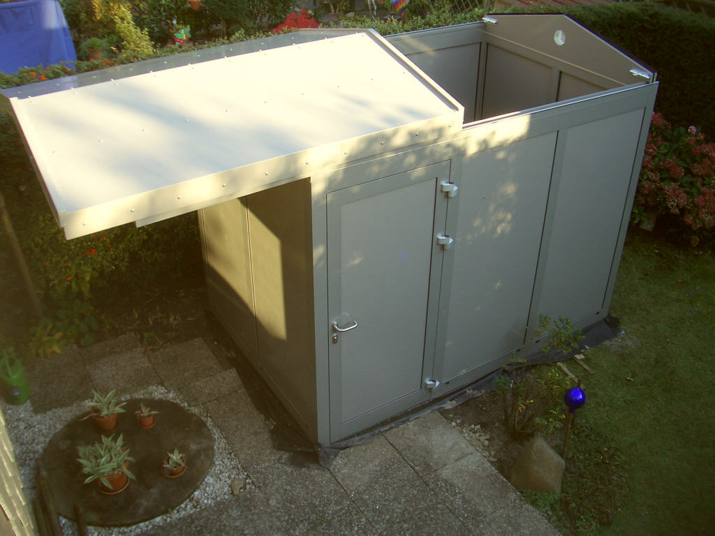 Gut sieht sie aus, meine neue Sternwarte. Die umlaufenden Gummischürzen müssen noch eingegraben werden, um Besucher unter der Sternwarte zu vermeiden. Nahe den Enden der Laufprofile für das Dach sind Schrauben mit Hutmuttern angebracht, die als Stopper beim Aufschieben des Dachs dienen.