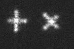 Um dieses unerwartete Verhalten zu analysieren wurde die Maske etwas verändert und führte dann zur obigen Sequenz. Wieder stehen die Spikes im Fokus senkrecht auf den Schlitzen. Das erklärt, warum dieser umstand bei einer rechtwinkligen Anordnung der Schlitze gar nicht auffällt, da ja dann die Spikes auf den jeweiligen anderen Schlitzbildern zu liegen kommen. |