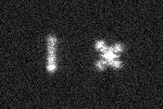 In der obigen Sequenz ist links die Maske dargestellt und dann drei Bilder eines hellen Sterns fernab vom Fokus, bei der Annäherung an den Fokus und im Fokus. Während fernab vom Fokus die Form der Schlitze wiedergegeben wird, werden kurz vor dem Fokus bereits die "Spikes", Beugungsfiguren durch Beugung des Lichts am Spalt sichtbar. Außerhalb des Fokus sind sie doppelt, im Fokus schmal und mit variierender Helligkeit. Am erstaunlichsten mag aber sein, daß der senkrechte Schlitz einen waagerechten Spike produziert. |