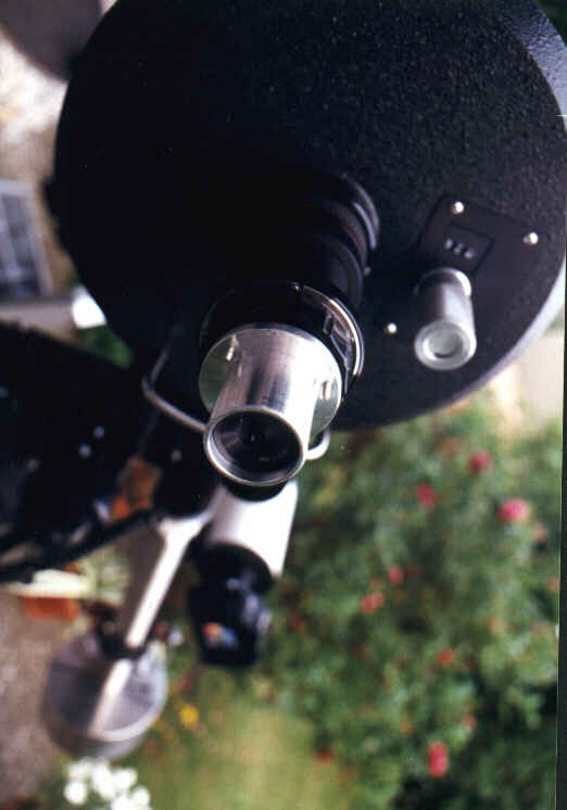 | Fokussieradapter für Kleinbildkamera Das Fokussieren des Teleskops für die Kleinbildfotografie durch die Teleskopoptik ist eines der größten Probleme bei der Astrofotografie. Viele Hilfsmittel werden kommerziell angeboten. Ich verwende eine sehr simple Methode. Eine Pappscheibe von der Größe der Teleskopöffnung, in die 2 Löcher geschnitten werden, erzeugen bei der Betrachtung einer Punktquelle (Stern) ein Doppelbild, solange man sich nicht im Fokus befindet. Erst im Fokus fallen beide Bilder zusammen. Je größer die beiden Löcher sind, umso heller ist das Bild. Solch eine Scheibe ist unter dem Namen Scheinerscheibe bekannt und wird auch als KWIK-Focus kommerziell vertrieben. Aber selbst diese Methode ist, durch den Sucher der Kamera, immer noch zu ungenau und unbequem. Ich habe mir deshalb einen Adapter aus einem Fotoobjektivdeckel, einer Okularhülse (Alu) und einem 6 mm-Okular gebastelt, den ich statt der Kamera auf das Bajonett des T-Rings schrauben kann. Durch die hohe Vergrößerung kann ich nun sehr genau auf einen helleren Stern fokussieren und tausche danach nur den Adapter gegen die Kamera aus. Die Position des Okulars in der Okularhülse habe ich bei Tageslicht im Vergleich der Fokussierung mit dem Schnittbildentfernungsmesser der Kamera bestimmt und dann das Okular festgeklebt. In Verbindung mit der Scheinerscheibe ist die Fokussierung nun kein Problem mehr. Man darf nur nicht vergessen, die Scheinerscheibe hinterher wieder von der Teleskopöffnung zu nehmen . . . |
