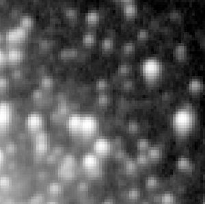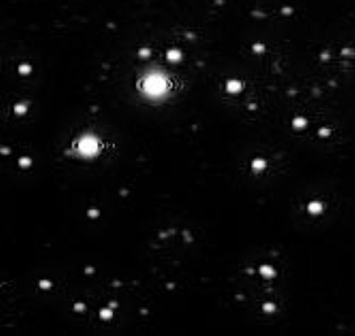 Der vergrößerte Ausschnitt aus dem obigen Bild zeigt die Halbkreise links und rechts von hellen Sternen deutlicher. Die Ausleserichtung des CCD-Chips ist parallel zu seiner Längskante und zur Längskante des Bilds. Wegen der Kreisform des Sternbilds sind die Überschwinger halbkreisförmig ausgebildet. Charakteristisch sind die schwarzen Zwischenräume zwischen den Halbkreisen. Mathematisch gesehen hat die Helligkeitsfunktion hier negative Werte, die aber von der Elektronik auf den Wert 0 gesetzt worden sind. Bei mittelhellen Sternen ist von den Bögen nur der hellste, mittlere Teil (im Bild links: rechts und links von den Sternen) zu sehen. Mit hellen Sternen bezeichne ich in diesem Zusammenhang Sterne der 11. Größenklasse. Umfangreiche Tests hatten gezeigt, daß dieser Effekt nicht auf die Kamera, das Videokabel bzw. seine Länge oder auf irgendwelche Störstrahlung von in der Nähe befindlichen Geräten zurückgeführt werden konnte. Er ließ sich auch nicht durch Weglassen des 20 Meter langen Videokabels oder eine andere Spannungsversorgung der Kamera signifikant beeinflussen. Somit blieb als Ursache nur der Framegrabber übrig. Andere Nutzer von Watec-Kameras kannten diese Effekte zum Teil auch. Aber eben nicht alle. |