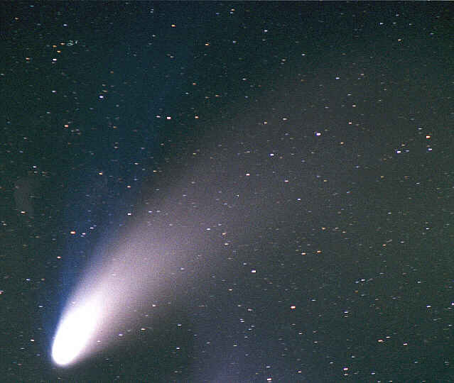 Komet Hale Bopp bei seiner größten Annäherung an die Erde Datum: 01.04.97, 21.32h MESZ Optik: f=300 mm f/8 Nachführung: Huckepack auf CG9, auf Hale-Bopp nachgeführt Belichtungszeit: 20 min Film: Scotch Chrome 400 Aufhellung am unteren Rand durch Fremdlicht (Kamera war nicht lichtdicht.) | |