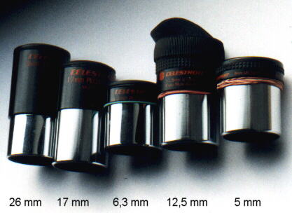 | Meine (Plössl)-Okulare Natürlich kommt man mit dem einen, mit dem Teleskop mitgelieferten Okular nicht aus. Bei meinem C9 war ein 26 mm Plössl-Okular im Lieferumfang enthalten. Das ist ein Standardokular von optisch passabler Qualität (Made in Taiwan). Für höhere Vergrößerungen habe ich mir dann ein 12,5 mm und ein 5 mm Plössl-Okular aus der Ultima-Serie (Made in Japan) von Celestron geleistet. Beides sind modifizierte Plössl-Okulare mit 5 Linsen, während die normalen Plössl-Okulare 4-linsig sind. Das Eigengesichtsfeld beträgt bei allen Okulare 50-52°. Das Einblickverhalten, d.h. Augenabstand und Finden der besten Einblickposition ist bei den 26 mm und 12,5 mm Okularen gut, beim 5 mm Okular klebt man mit dem Auge auf der Linse. Bei der Fotografie von Objekten des Sonnensystems mittels Okularprojektion hatte ich festgestellt, daß zwischen dem 26 mm und dem 12,5 mm Okular noch eine Lücke klaffte. Die habe ich dann mit dem 17 mm Plössl-Okular (Standard-Serie) geschlossen. Für die Okularprojektion ist es ganz in Ordnung, aber das Einblickverhalten ist für meine Begriffe etwas problematisch: Ich habe nämlich Probleme, die richtige Einblickposition zu finden. Das 6,3 mm Plössl-Okular (Standard-Serie) habe ich mir als Fokussierokular angeschafft. Dafür tut es seinen Dienst, und ich brauche nicht das "gute" 5 mm Ultima zu nehmen. Überhaupt, aufgrund der Seeing-Bedingungen kommt das 5 mm Okular nur selten zum Einsatz. Meistens ist die Luft viel zu unruhig, um mit dem 5 mm Okular wirklich noch mehr sehen zu können. Aber wenn die Luft ruhig ist, dann sind Planetenbeobachtungen oder Kugelsternhaufen mit dem C9 und dem 5 mm Okular ein Genuß! M13 erscheint vollformatig und in tausende nadelfeiner Lichtpünktchen aufgelöst. Jupiter und Saturn füllen einen Großteil des Blickfelds aus und lassen viele Strukturen in den Wolkenbändern erkennen. Auf dem obigen Bild fallen wahrscheinlich sofort die farbigen Gummiringe um die Steckhülsen einige Okulare auf. Mit diesem Trick habe ich die Okulare homofokal gemacht. Auch wenn die Hersteller behaupten, ihre Okulare seien homofokal, kommt man letztendlich nicht darum herum, beim Okularwechsel doch noch ein bißchen nachfokussieren zu müssen. Da mir das auf die Nerven ging und vor allem bei meinem Okularadapter beim Wechsel zwischen Zentrier- und Fokussierokular nicht tolerierbar war, habe ich durch Probieren herausgefunden, daß die Fokuslage der verschiedenen Okulare sich doch um deutlich meßbare Strecken unterscheidet. Dadurch kann man ganz normale Gummiringe in der erforderlichen Anzahl über die Okularsteckhülse streifen und hat wirklich homofokale Okulare, bei denen nach einem Okularwechsel nicht nachfokussiert werden braucht. Nicht abgebildet sind meine apochromatische Barlow-Linse, die ich meistens in Verbindung mit dem 9 mm Plössl-Fadenkreuzokular zum genaueren Nachführen benutze, und mein neuestes Okualar, ein 9 mm Nagler mit unglaublichen 82° Eigengesichtsfeld. Damit kann man tatsächlich um die Ecke sehen, d.h. die Gesichtsfeldblende ist größer als das Gesichtsfeld von etwa 60°, das man auf einmal überblicken kann. Und dabei bietet das Okular noch einen angenehmen Augenabstand beim Einblick. | |